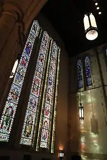 The second artisan in Pittsburgh significant to Calvary's stained glass was Charles J. Connick (1875-1945). Connick originally worked under Willet at the Pittsburgh Stained Glass Company. He, having studied with Willet, was also a leader in the recreation of medieval stained glass techniques. Some of his best work is located in Pittsburgh, including Calvary Episcopal Church, where there are fourteen major windows plus sixteen lantern tower and twelve chancel clerestory windows by him in the church. Connick also designed several other windows located throughout the building.[4]