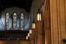 The current building's first organ, a gift of Mr. John B. Jackson and Miss Jackson, was built by the M.P. Moller Company of Hagerstown, Maryland and used between 1907 and 1963. The instrument had four divisions and electric-pneumatic action. The instrument was described in 1908 as "fully adequate to the great size of the building, filling it to the utmost when desired, and yet the softest tones are heard in the most remote parts of the church." This organ console sat on a platform near the High Altar.[7]
