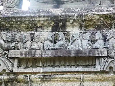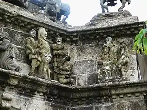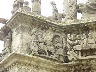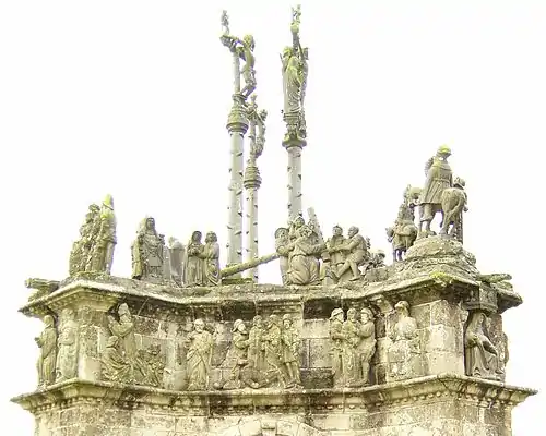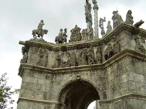 It has two distinct levels. The lower level comprises a corniche running around the entire structure and the upper level or platform. Four buttresses strengthen the calvary and an arcaded passage runs through the centre producing an Arc de Triomphe like effect. The statuary decorating the calvary, placed either on the platform or on the corniche, is carved from kersanton stone or in some cases from grey arkos, a stone less resilient to erosion. The calvary should be read anti-clockwise starting with the Annunciation on the corniche of the southwest buttress and ending with the Crown of thorns episode, whereas on the platform, one's reading should start with the "Ecce Homo" scene and finish with the "Descent into Hell". The "Mise au tombeau" is placed in the centre. The sculptures on the lower level (the corniche) are smaller than those on the platform.[1][2][3]