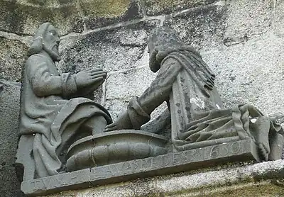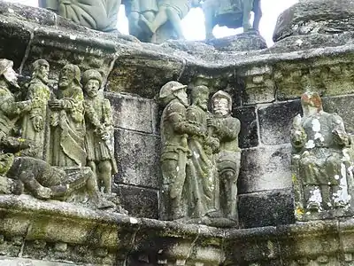 Note 1: Apart from the Prigent brothers and their team of masons, a major contribution was made to the Pleyben calvary by a sculptor who is known as "Le compagnon de Pleyben".[1] This third sculptor worked in grey sandstone rather than kersantite. The contributions were the heads of the soldiers and the Jewish priest in the "Ecce Homo" scene, Jesus and the devil in the scene depicting the devil tempting Jesus, Saint Peter in the scene depicting the agony in the garden of Gethsemane, all the figures in Jesus' arrest other than Jesus himself, the figures apart from Jesus in the scene depicting the appearance before Caiaphas, all the characters in the "Christ aux outrages" except for Jesus himself, the figures in the flagellation scene apart from Jesus and those in the scene depicting the crown of thorns being applied to Jesus' head again other than Jesus himself.[1]