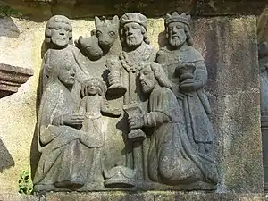 • The adoration of the Magi. The Virgin Mary sits holding the baby Jesus and Joseph is behind her. The first king is on his knees, has placed his crown on the ground and offers his present in a sort of square chalice. The other two kings stand, their crowns on their heads and hold vases containing their gifts. One's costume is completed by a small cross and type of coif whilst the other has a cord around his shoulders from which a cross is suspended. The cow and the ass are at Joseph's side.[6]