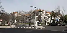 The lyceum of Camões was constructed to substitute the old National Lyceum of Lisbon, created in 1902, and inadequate for the teaching needs and number of students.[1] At the time of its inauguration there was a general consensus that the building had beautiful conditions and a model for hygiene and pedagogic teaching, as reported by the newspapers.[1] Critics noted that the school was isolated on the square (the Largo do Matadouro Municipal), which was a natural zone on the edge of urban expansion and little accessible.[1] The lyceum, owing to its purpose-built nature (from scratch and specific to teaching) was an architectural educational reference, both formally and esthetically, respecting the functional necessities of the site.[1] The great number of students that this urban lyceums received, and that hygiene theories at the time, meant that there was an obligation to include physical education classes, resulting in a modular system of pavilions used for complimentary classes, with patios and exterior recreational spaces. The principal wings, used for traditional teaching rooms were linked to new sporting pavilions, gymnasium, change rooms and projected swimming pool (which were unique for the country at the time).[1] The lyceum was a public utility, functional and rationalist. It was projected to integrate into the urban fabric, albeit isolated initially.[1] Ventura Terra delineated a construction model that was more simple then the habitual designs, responding to the a request by the first rector of the Central Lyceum, Rui Teles Palhinha: