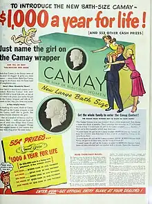 Camay is an American brand of bar soap owned by Unilever. It was introduced in 1926 by Procter & Gamble and was marketed as a "white, pure soap for women," as many soaps of the time were colored to mask impurities. Camay's slogan for many years was "Camay: the soap for beautiful women." It was later replaced with "For your most beautiful complexion at every age."