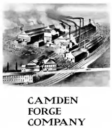 The Camden Forge Company (or Camden Forge for short) was an American steel forging company founded in 1901 and shut down during 1956,[1][2] supplying custom forgings for anything from rods and bolts to steers and axles. The company's original address was the corner of Mount Ephraim Avenue and Bulson Avenue in Camden, NJ. After a few years the official address was changed to Mount Ephraim Avenue and the Atlantic City Railroad.[3][4] During both World War I and World War II, they supplied materials for ships made by New York Shipbuilding Company.[5] In July 1942, the company received the award for the Army and Navy "E" pennant for excellency in the production of war materials. The pennant received had 5 stars.[6] Closing in 1956, the company went to public auction on April 10, 1956, at auction the company was worth $8,500,000.[7] Camden Forge's Commercial and Government Entity code is 10399.[8]