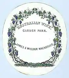 Wine label of James and William Macarthur — used for wine produced at Camden Park Estate.