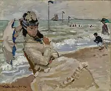 Camille and Monet were married on 28 June 1870[8] in the 8th arrondissement of Paris during a civil ceremony. Painter Gustave Courbet was a witness. Although Monet's father was not present because he did not approve of his marriage, Camille's parents attended the ceremony.[3] Upon her marriage, Camille received a 1,200 franc dowry, which represented two years interest on a principal investment that she would receive upon her father's death. Her parents stipulated that the dowry money should be kept in a separate account in Camille's name. This was done to protect the money from Claude Monet's creditors.[8] The couple took their son Jean with them on their honeymoon to Trouville-sur-Mer and stayed at the Hotel Trivoli. Continuing to avoid creditors, Monet also sought to avoid being drafted to serve during the Franco-Prussian War. He left his bride and son to go to Le Havre to visit his ailing father and then on to England, "presumably" with money given to him by his father. Camille and Jean met up with him in England in October 1870.[9]