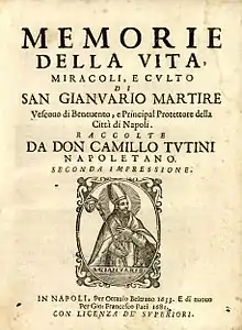 ![]() Memorie della vita miracoli e culto di San Gianuario Martire, second edition, 1681 | |