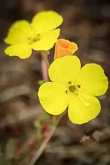 Camissoniopsis bistorta is a species of flowering plant in the evening primrose family known by the common names southern suncup and California suncup. It is native to southern California and Baja California, where it grows in several types of plant community along the coast and in the coastal hills and mountain ranges. This is a hairy annual or short-lived perennial herb spreading from a basal rosette, with stems reaching up to 80 centimeters long. The leaves are narrow and sometimes toothed, and 1 to 12 centimeters in length. Toward the end of the spreading stems are nodding inflorescences of flowers, each flower with four bright yellow petals dotted with red at their bases.[2][3]
