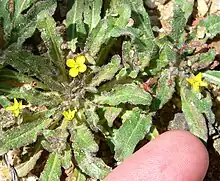 This species is an annual herbaceous plant that forms a basal rosette of leaves. It is covered in dense, grayish, spreading hairs. The stems are decumbent and branched or erect and simple, and are usually less than 60 cm (24 in) long. The dark green leaves are 1 to 12 cm (0.39 to 4.72 in) long. The basal (on the rosette) leaves are the largest. The cauline leaves are generally shaped narrowly lanceolate, with minutely dentate (toothed) margins, and are sessile.[5]