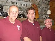 Camp Agawam was founded in 1919 by Appleton A. Mason, known as "The Governor", an American football player, coach of football and basketball, and physical education instructor.[7][8][9] The camp was run by him until his death in 1938, and then taken over by his sons, Appleton Mason, Jr (1939–1956) and David W. Mason (1957–1985). Since David Mason's retirement, it has been managed by Agawam Council, a non-profit organization, whose board is composed of former campers.[6][7][8] The camp in the late 1980s was still run along traditional lines, according to Peter Anderson of the Boston Globe, writing in 1988, who calls it "an old camp with old ideas."[6] He describes traditions such as bugle calls for reveille and retreat, when the camp's flag is lowered, candle-lit processions, and former campers being remembered with flat stones and totem poles dating back to 1934.[6]