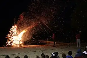 July 4 is the first pinnacle event of the summer. The camp hosts its own carnival during the day, where each bunk creates its own booth in addition to those rented by the camp. At night is the annual Bonfire and Chip Ceremony. The bonfire is built entirely by Bunk 14, who name the bonfire and place a sign at the top with the name. The bonfire can be as tall as 16 feet (4.9 m). The entire camp gathers in front of the bonfire to watch it burn. Once the fire has burned long enough, and has started to die down, the chip ceremony begins. Each bunk chooses a member to stand in front of the fire, and make a speech. After they make their speech, they take a wood chip, and throw it into the fire. The speech usually is about their camp experience, or what camp means to them. Many speeches often revolve around how they believe Avoda is the greatest place on earth, and how the feeling of being there is indescribable. After all the bunks have gone, Bunk 14 goes, with 3 speakers. After Bunk 14 has gone up, all of the old Bunk 14's are called up by year, until you get to the oldest staff members and administrators, and finally the director.