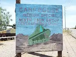 • Camp Bouse – The 701st Tank Battalion – Campaigns – Central Europe Northern France Rhineland – Camp Bouse – The 701st tank battalion was activated 3/28/43 at Camp Campbell, KY. Here 553 young men and officers began their journey into history. These men began their basic training and for many saw a tank for the first time. The 701st relocated to Fort Knox, for further training. The battalion received orders on 12/8/43 to relocate to Camp Bouse, the mysterious secret camp. The men were introduced to the Grant Tank, a WW I designed tank which now had a 13 million candlepower light, "The Gizmo" mounted in the turret. Thus began the canal defense light project training. The 701st left Bouse for Camp Kilmer, N.J. on 3/27/44 and then onto England aboard the R.M.S. Mauretania. The BN arrived at Liverpool on 5/1/44 and trained at Puncheston, Wales. The 701st landed on Utah Beach, Normandy, France on 8/24/44. Here, most of the CDL Grant Tanks were replaced by Sherman Tanks. The BN moved north through France and Belgium and on December 21st moved out from its positions at Heerlen, Holland and crossed the Siegfried Line into Germany at Uback. The 701st crossed the Roer River and saw its heaviest combat near Tetz, Hottorf, Viersen and Krefeld beginning on 2/25/45. The BN crossed the Rhine on 3/29/45 and pushed through Munster, Bunde and Bismark. At Gardelegen, the 701st uncovered an atrocity where 1016 prisoners of war and political prisoners had been murdered by the enemy. As the wars end neared, orders were received to halt forward movement, finding the BN on the banks of the Elbe River, 50 miles from Berlin, thus ending the fighting of 701st. This monument is dedicated to all these young soldiers and officers who gave of themselves, and especially to those 48 members of the BN who lost their lives in battle for the freedom of mankind. Erected 1998 by Lost Dutchman and Billy Holcomb Chapters of E Clampus Vitus and the 701st Tank Battalion Association and the Bouse Chamber of Commerce.[15]