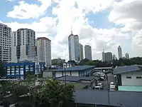 The blue-roofed Philippine National Police, Camp Crame buildings as viewed from the Santolan - Annapolis station.