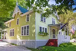 The Welcome House, or Fred W. Cron Cottage, us a two-story L-shaped balloon-framed cottage with a gable roof. Fred Cron was a Manistee dealer in furniture and carpeting, and constructed this cottage as one of the first on Cleveland G. Davis's Red Park Resort. The cottage was built in 1896, and Noble Hill purchased it in 1927.[3]