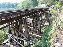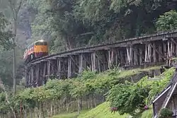 The Wang Pho Viaduct, (also: Wampo Viaduct) is a railway bridge made of wooden trestles which follow the cliff along the Khwae Noi River. The Wang Pho viaduct was constructed by allied prisoners of war of the Japanese during World War II as part of the Burma Railway. It is sometimes referred as the Double Viaduct, because of a nearby smaller viaduct.[1] The viaduct is still in use and can be reached from the Wang Pho railway station.[2]