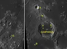 By convention these features are identified on lunar maps by placing the letter on the side of the crater midpoint that is closest to Campanus.
