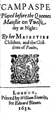 So too does the next edition of the play, printed with its own individual title page in Edward Blount's 1632 collection of Lyly's plays Six Court Comedies, which uses Q4 as its copy text. Blount had entered it into the Stationers' Register on 9 January 1628, naming each play individually under a group entry.[5] This edition not only modernised some of the spelling, but also printed the lyrics of three of the play's four songs for the first time (the last, in Act 5 scene 3, remains missing). Amongst them is the often reprinted Cupid and my Campaspe, sung by the love-struck Apelles at the end of Act 3, in which he describes Cupid gambling away parts of himself: