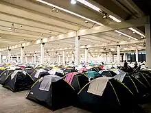 Campus Party is typically held in large indoor arenas and split into 3 areas: the "Arena" area, - a 24/7 meeting place for talks, workshops, challenges, hackathons, call for ideas and special activities -, the "Experience" area - a place for startups and makers, games, simulators, robots and drones, virtual and augmented reality, academic projects, and more -, and the "Village" area which includes camping, restaurants and a dining hall, and a relaxation zone that has couches, bean bags, TVs and gaming consoles, free massages and in Valencia, a sport arena with basketball and football fields.[25]