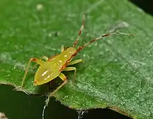 Campyloneura virgula can reach a length of 4–5 millimetres (0.16–0.20 in).[2] Adults have pale translucent hemelytra,[3] a red stripe on the edge of a pale green pronotum, a yellow scutellum. a black head, long red-banded antennae and bright yellow cuneus that are tipped with dark red.[2] Legs are pale yellow.[3] Nymphs are yellow, with a red stripe on the edge of the pronotum.[4]