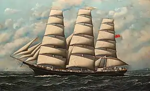 Canada was a full-rigged ship built in 1891 at Kingsport, Nova Scotia on the Minas Basin and was the largest sailing ship operated in Canada when launched in 1891. Canada was built and owned by Charles Rufus Burgess of nearby Wolfville, Nova Scotia. Despite the decline in wooden shipbuilding, Burgess saw that there was still potential for very large wooden sailing ships to make profits in the twilight days of the wooden sailing ship era. He had built the barque Kings County, the previous year, the largest four-masted barque ever built in Canada.[2] Burgess planned to make Canada to be the largest sailing ship ever built in Canada, but damage, during harvesting, to a timber intended for the keel caused her length to be trimmed by ten feet making Canada slightly smaller than the ship William D. Lawrence built in 1874.[3] However, as the William D. Lawrence had been sold to Norwegian owners and renamed in 1883, the ship Canada still claimed the honour of being the largest sailing ship under the Canadian flag at the time of her launch. Between 75[4] and 150 men[5] were employed in building the ship. Canada was designed by master builder Ebenezer Cox who was in charge of the Burgess Shipyard in Kingsport where he had built ships since the 1860s and was regarded at the time to have built more ships than any man in Canada.[6] The construction cost $111,000. Her interior included a finely outfitted captain's cabin, finished in walnut, ash and rosewood with a full dining room, office and bathroom. Her launch at noon on July 6, 1891 attracted 5,000 people from all across Western Nova Scotia, brought by multiple special trains run by the Cornwallis Valley Railway. It was regarded as the biggest event in the history of the village.[7] A tug took the completed hull of Canada from the launch at Kingsport to Saint John, New Brunswick where the masting, rigging and outfitting was completed at the Customs House Wharf. Her immense size attracted hundreds to the Saint John waterfront to see Canada depart on September 1, 1891 for her maiden voyage, carrying with a cargo of lumber worth $144,109 bound for Liverpool, England.[8] Classed A1 by Lloyd's Register for 14 years, Canada made several fast passages between South America and Australia. However by 1900, the ship was facing stif competition for cargoes from the growing numbers of general cargo steamships. Canada was converted to a gypsum barge in 1910, carrying gypsum from Windsor, Nova Scotia to Staten Island, New York for the Gypsum Transportation Company of New York. She was towed a final time from New York to Portland, Maine in 1926 where she was broken up.