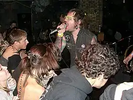 The 3tards were a Canadian hardcore punk rock band that was formed in Brampton, Ontario, in 2001.[40] They released two full-length albums - Greatest Hits Vol. 2 (Wounded Paw, 2004, re-released by Spinerazor/Universal Music Canada, 2006) and Crystal Balls (Spinerazor/Universal Music Canada, 2005).[41] They were known for their satirically outrageous, vulgar and sexual lyrics, wild live shows including costumes, theatrics (they've staged live births,[42] circumcisions,[43] blood baptisms,[44] etc. as part of their act), and socially liberal politics (for example following its legalization in Canada they held a mock gay wedding on stage between John Tard and Fox Tard, including a passionate kiss between the two).[45] They have been described as "Canada's most politically incorrect punk band."[46]