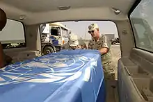 United Nations members prepare to load flag-draped metal transfer cases carrying the remains of bombing victims from the UN Office of Humanitarian Coordinator for Iraq (UNOHCI).