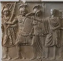 Frieze A originally depicted Domitian as he prepared to depart for a campaign against the Chatti.[6] Contemporary authors such as Suetonius later alleged that Domitian's military endeavours were largely a failure, motivated by a quest for personal glory rather than necessity.[7] The scene depicted on Frieze A seems to counter such accusations by presenting Domitian as a reluctant general, spurred on by the gods Mars, Minerva and Roma, who are pictured on the far left, to defend his home country.[8] Other characters who appear in this scene are the Genii, or guardian spirits, of the Roman Senate and the people of Rome, and a number of soldiers.