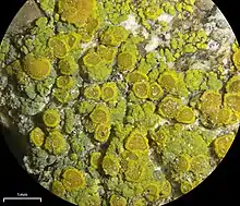 Candelariella vitellina is a common and widespread green-yellow to orange-yellow crustose areolate lichen that grows on rock, wood, and bark, all over the world.[1] It grows on non-calcareous rock, wood, and bark.[1]