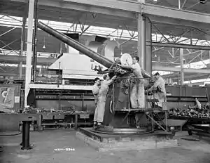 During World War I the United Kingdom delivered a QF 4 inch Mk V naval gun, serial No.974 to Italy to act as a template for licensed production by the Ansaldo Company. The Mark V was constructed of a tapered inner A tube, A tube, taper wound wire, full-length jacket and breech ring.[2] It had either a horizontal or vertical sliding breech block, with semi-automatic action and used fixed quick-fire ammunition. There were three models produced: Schneider-Armstrong Model 1917, Schneider-Armstrong Model 1919, and Schneider-Canet Model 1917; each with differing mounts and elevations. Overall the 102/45 was considered a successful design and it was widely used on destroyers of the Italian Navy before and during World War II. The exception being the Schneider-Armstrong Model 1919 which was an unsatisfactory twin mount with both guns sharing a common cradle. The Model 1919 was later replaced by single mounts during the war.[3] The 102/45 was in the process of being replaced by the Cannon 120/45 and 120/50 when World War II began. Starting in 1937 guns that were removed from ships were mounted on new dual-purpose shore mounts and used as anti-aircraft guns and coastal artillery until retired in 1945.