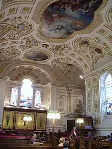 The rest of the house and contents were dispersed across the country and the location of much has been lost, however some substantial elements can still be seen, including the Ionic columns from the colonnade which some sources now place in front of the National Gallery in London.[24] Elements of the chapel, in particular stained glass windows designed by Sebastiano Ricci and made by glass painter Joshua Price, along with Bellucci's ceiling paintings[25] were purchased by Thomas, Lord Foley and installed by James Gibbs in the Church of Saint Michael and All Angels, Great Witley, Worcestershire.[12] The chapel's organ was built by Abraham Jordan Jr, who with his father is credited with the invention of the swell box. There is some dispute as to where the instrument was moved, as some sources say it is identifiable as the organ in the church at Great Witley, whereas Holy Trinity, Gosport, claims to have some of the pipework.[26] There is a tradition that the gates were removed to Trinity College, Oxford, but this is incorrect, for the College's two sets of gates both predate the demolition of Cannons and are well documented.[27]