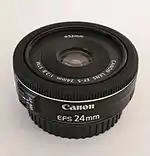 • EF-S 24mm f/2.8 STM, announced September 2014.[7] Unlike the other 24mm lenses, it will mount only on bodies that support the EF-S mount. It will mount on all current Canon DSLR bodies with APS-C sensors, as well as older APS-C bodies dating to the 2003 introduction of the EF-S mount (in other words, the EOS 10D and older bodies are not compatible). It will not mount on any DSLR body with a full-frame or APS-H sensor. It also cannot directly mount on Canon's mirrorless bodies (either the APS-C EF-M mount or the full-frame RF mount), but the company sells adapters that allow EF-S lenses to be used on either mirrorless mount. As it is designed for Canon APS-C bodies, its field of view is equivalent to a 38mm lens on a full-frame sensor, and operates similar to the Canon EF 40mm f/2.8 STM pancake lens. Compared to the EF 24 f/2.8 IS USM, the EF-S lens loses IS, but lists for about a fourth of the price. The STM offers advantages for video shooting over USM, specifically quieter autofocus.