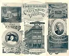 On Boxing Night 1867, William Holland took over management of the Canterbury and refurbished the hall at considerable cost. When informed that his purchase of a 1,000 Guinea carpet was too good for his clientele, he invited them "to come in and spit on it".[8] Further popularity accrued to the venue when classical music was removed from the bill and George Leybourne was engaged at £20 a week as lion comique.[8] Leybourne remained top of the bill for some twenty years, before succumbing to the effects of the champagne he promoted here under the guise of "Champagne Charlie".[12]