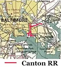 The Canton Railroad Company was chartered in 1906 by the Canton Company,[3] to serve industrial, manufacturing, and shipping customers in the Baltimore port area. Its tracks, starting from the interconnection with the Pennsylvania Railroad, were laid during the period from 1905 through 1914. The Canton track interconnected with the B&O Railroad in 1910. Rail operations began in 1907.[2]