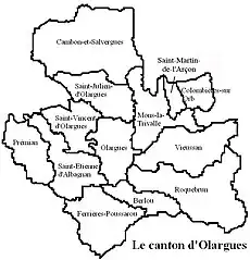 The Canton of Olargues is a former subdivision of the French department of Hérault, and its subdivision, the Arrondissement of Béziers. It had 4,416 inhabitants (2012).[1] It was disbanded following the French canton reorganisation which came into effect in March 2015. It consisted of 13 communes,[1] which joined the canton of Saint-Pons-de-Thomières in 2015.[2]