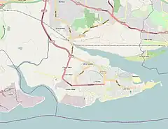 The extensive sea wall, completed in 1982, is 15 miles (24 km) long and surrounds 75% of the island's perimeter terminating with flood barriers spanning Benfleet Creek to the north and East Haven Creek in the west. The drainage system consists of sewers, culverts, natural and artificial dykes and lakes which feed seven pumping stations and gravity sluices that discharge the water into the Thames and creeks. Four of the discharge sites are "high flow" stations capable of discharging 600 litres of water per second at any tide level. The levels within the system are managed by a further five "low flow" pumping stations.[4] The Environment Agency's Thames Estuary 2100 flood defence plan includes Canvey Island as one site for alleviating the flood risks to London and the Thames estuary area. It is proposed that the western side of Canvey is developed as a site which is either temporarily flooded at times of risk, or transformed into a permanent wetland.[44][45]