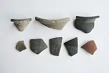 Excavations on Canvey have unearthed a collection of early man-made objects comprising axes from the Neolithic era,[5] a bracelet dating from the Bronze Age,[6] and Iron Age pottery.[5] However, the remains of Roman structures and objects suggests the first settlement of Canvey occurred between AD 50 and 250.[5][7] The remains point to a community existing with a farmstead, a garrison, a burial ground, and the operation of a large salt-making industry (revealed by the existence of several red hills).[5][8]