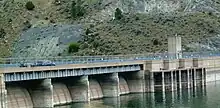The dam is a 225 ft (69 m) tall concrete gravity type and has a length of 1,000 ft (305 m). The crest of the dam is 20 ft (6 m) while the base is 173 ft (53 m). The dam structure compromises a total of 414,400 cu yd (316,832 m3) of concrete. The dam's spillway is located on its central portion and is controlled by four radial gates. It has a maximum discharge of 150,000 cu ft/s (4,248 m3/s). Adjacent to the spillway is the dam's power plant which contains three 16.5 MW Francis turbine generators for an installed capacity of 50 MW. Each turbine is fed with water by a 13.5 ft (4 m) diameter penstock. At a normal elevation of 3,797 ft (1,157 m), the reservoir contains 1,891,000 acre⋅ft (2.332514155×109 m3) of water.[2]