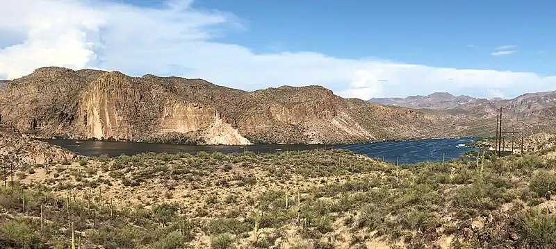 Canyon Lake is one of four reservoirs that were formed by the damming of the Salt River in the U.S. state of Arizona as part of the Salt River Project. It was formed by the Mormon Flat Dam, which was completed in 1925 after two years of construction. Canyon Lake, with a surface area of 950 acres (380 ha), is the third and smallest of the four lakes created along the river. Two others, Apache Lake and Roosevelt Lake, are upstream. The fourth, Saguaro Lake, is downstream.