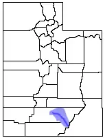 The headwaters of the Escalante River are located on the slopes of the Aquarius Plateau, in Utah's Garfield County, just west of the town of Escalante. The Escalante River begins at the confluence of Birch Creek and North Creek,[1] with the flow of Pine Creek added just below the town.[2] The river runs a total distance of 80 mi (130 km) from the Birch/North Creek confluence before emptying into the Colorado River in Kane County.[3] The lower section of the river, southeast of Coyote Gulch, is now beneath the surface of Lake Powell.