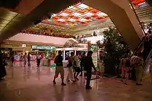 It was towards the end of the 1960s that Jean Demogé, PDG of Nouvelles Galeries, had the idea of building a large shopping center near Nice-Côte d'Azur airport.[2] The location corresponds to a vast wetland on the banks of the Var, well served by communication routes. When it opened on October 21, 1969, the center was modern, ahead of its time, and inspired by the American shopping centers of the time.[2] Thus, the centre's first promotional brochure states: « Cap 3000 is a living center where, in a pleasant atmosphere, dreams and relaxation mingle with the necessities of everyday life ».[2] The name of the center is the abbreviation of capacity 3,000 places, in reference to the number of parking spaces.[3][4] The shopping center is the first of this size in France, and is followed by the opening two weeks later of Parly 2.[5] It initially consisted of fifty-two stores surrounding the New Galleries on two levels, and was air-conditioned.[2][6] On the roof, a swimming pool is built whose transparent bottom allows customers of the shopping center to see the swimmers.[7] Its main pool measures 22 meters by 11, is accompanied by a pool for children, and is surrounded by loggias.[6] The center also includes a 400-seat cinema, a drugstore open in the evening, and a restaurant that can accommodate 350 people served by means of a treadmill.[6] Cap 3000 then had approximately 2,000 employees.[6]