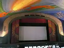 The Cape Cinema was founded in 1930[2] by Edna B. Tweedy and Raymond Moore, three years after Moore founded the Cape Playhouse.[3] The building's exterior was designed by Alfred Easton Poor and modelled after the South Congregational Church in Centerville, Massachusetts.[4] The auditorium is designed in the Art Deco style and includes 317 armchairs of black lacquer and tangerine suede produced by the Frankl Galleries in New York City. Moore and Tweedy commissioned American painter and illustrator Rockwell Kent to design a 6,400-square-foot mural for the auditorium's ceiling, featuring a representation of the heavens and constellations; it was installed by set designer Jo Mielziner.[2]
