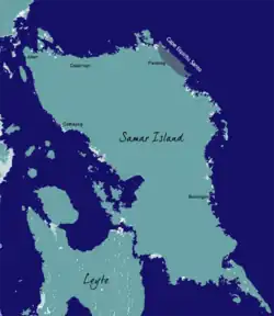 Cape Espiritu Santo, also known as Cape Espiritu Santo Mountains,[1] is the northeastern point of the Northern Samar and the northernmost point of Samar Island. It was named Cabo Espiritu Santo by early European explorers, since it was discovered on the Feast of the Holy Spirit.[2] It is also the first land sighted by the Spaniards when sailing from Nueva España, marks the end of their long sailing as they approaches the land and coast of the Ibabaw in the Philippines. Spanish navigators noted the mountains' value as they are visible 40 miles out to sea.[3] There are two prominent summits in this location. One rises 1,481 ft (451.41 m) and the other 1,457 ft (444.09 m).[4]