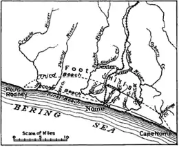 Cape Nome is a blunt, rocky headland on Seward Peninsula. The shore line between Cape Nome and Topkok is marked by large lagoons. West of Cape Nome, the shoreline, as far as Cape Rodney, is almost straight and uninterrupted except for the tidal inlets at the mouths of the larger rivers. Near the coast between Sinuk River and the flat-topped promontory of Cape Nome is a well-marked bench at an altitude of about 700 feet (210 m).[7] The shore line may formerly have extended from the hills west of Cripple River to Cape Nome, and probably formed a broad arc of fairly uniform curvature, like the present beach, but with smaller radius. The elevation of the depression between Cape Nome and Army Peak is 115 feet (35 m). Bed rock is traced northwestward from Cape Nome for a distance of nearly 5 miles (8.0 km), and in the low rounded hill between Hastings and Saunders creeks has an elevation of 297 feet (91 m). Between this point and the Army Peak schist mass, still farther to the northwest, is an interval of about 3 miles (4.8 km) across a broad, low saddle where no rocks are exposed. The Nome tundra gravels occupy the crescent-shaped lowland extending from Cape Nome to the hills west of Cripple River. The coastal plain or tundra gravel occupies the crescent-shaped area included between the sea and the hills and extending from Cape Nome to Rodney Creek, 14 miles (23 km) west of the mouth of Snake River.[5] Lagoons shut off from the sea by sand bars may be seen east of Cape Nome.[8]