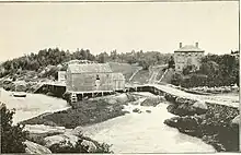 Around the era of the mining frenzy in the Western United States, in 1880 a copper vein was found near Goose Falls, a tidal estuary a quarter-mile southwest of Harborside (at 44° 21' N., 68° 48.5' W.). It is said that a clam digger at Goose Pond discovered zinc-copper sulfide ore deposits at low tide.[38] The mine at Goose Falls produced 10,000 tons of crude ore between July 1881 and September 1883, containing 20% zinc, 3% copper and some lead. The ore was hand-sorted and about 3,000 tons were shipped from the site.[2] However, the operation closed down in 1887 and remained inoperative for about half a century thereafter.