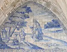 The interior ceiling is covered with a ribbed vault and golden rosettes, centred on the arms of House of Lancaster.[1][2] The high altar is covered in sculptures, located within niches on corbels with awnings. A rounded arch, with the arms of the founder, protect access to the main tomb. The walls are decorated in azulejo tile with figures from the creation of the world, while the pavement is covered in tomb slabs.[1][2]