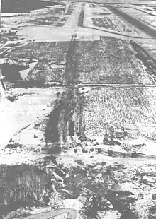 The contract flight impacted a four-by-four wooden fence 675 feet past the runway and an ILS localizer 1,002 feet past the runway on its left wing. A third impact soon followed, breaking open the fuselage and shearing off the right wing and subsequently leaking out fuel from it. It skidded to a halt in a 12 feet deep drainage ditch, 3,400 ft past Runway 6R with the break-out of a fire at the left wing, killing 46 passengers and a stewardess while leaving the cockpit area and the aft fuselage of the airframe intact. 43 passengers and 6 other stewardesses suffered severe burn injuries. Past only 560 feet of the runway, were several fragments of the landing gear tires.[1]