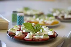 Caprese salad (Italian: insalata caprese [insaˈlaːta kaˈpreːze; -eːse] or simply caprese)[1] is an Italian salad, made of sliced fresh mozzarella, tomatoes, and sweet basil, seasoned with salt, and olive oil. It is usually arranged on a plate in restaurant practice.[2][3] Like pizza Margherita, it features the colours of the Italian flag: green, white, and red. In Italy, it is usually served as an antipasto (starter), not a contorno (side dish), and it may be eaten any time of day. The caprese salad is one form of a caprese dish; it may also be served as a caprese pizza, pasta, or sandwich.