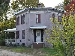 The Baxter House stands one block off the downtown area of the village of Hyannis, on the south side of South Street at its junction with Pearl Street. The house is located on the west side of its lot, with the smaller carriage house to the east. The house is two stories, with stuccoed concrete walls 18 inches (46 cm) thick, and a bracketed flat roof topped by an octagonal cupola. Two of its eight sides have entrances: the one facing the street is a simpler entrance sheltered by a bracketed hood, while that facing east is sheltered by a single-story porch extending across that facade, with a spindled balustrade and turned posts. Most of the other facades have two windows on each level; some have only one. The interior of each level has a central square chamber, around which are four smaller rectangular chambers, with the remaining triangular spaces used as closets. The carriage house, one story in height has a similar exterior finish and a smaller footprint, and is topped by smaller octagonal cupola. A two-leaf vehicle entrance is topped by a half-round fan; both the fan and the doors have strap woodwork decoration.[2]