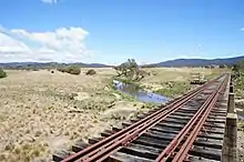The line was re-surveyed,[5] and another construction act was passed on 15 December 1937.[6] Construction commenced in February, 1938, with 600 men employed.[7]: 62 By June, work on the foundations for piers of bridges spanning Thurralilly Creek and Molonglo River was in hand.[8] The strengthening girders came from the original viaducts over Wollondilly, Boxers and Barbers Creeks on the Main South line which had been replaced during duplication work in the 1912–14 period.