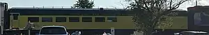 Car 553 was originally built for the Chicago and North Western Railway in 1949 by the American Car and Foundry Company as car 7901.[4] It was originally used as a lounge and barbershop car on City of Los Angeles, a long distance train service between Chicago and Los Angeles.[5] In 1961, car 7901 was rebuilt for commuter service and renumbered 553.[4] On November 30, 1975, the car was acquired by Commuter Associates Inc. and continued to see service on the C&NW, operated by the commuter rail branch of the Regional Transportation Authority (which was reorganized into Metra in 1984).[1] In the 1990s, the first female members purchased seats on the car.[2] Car 553 still wore the brown and white color scheme of the pre-Metra Regional Transportation Authority's passenger equipment until late 2017 when it was restored to its original C&NW yellow and green colors and lettering.[1]
